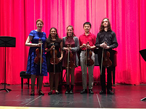 Dr. Voigt recently taught a violin master class at Bowling Green State University as part of a master class exchange. In this picture, Dr. Penny Thompson Kruse, Professor of Violin at Bowling Green, poses with participating students from the Cincinnati master class, which was held at Princeton High School's Matthews Auditorium. Abbie Wood (Center), one of Derek Voigt's students, performed J.S. Bach's Partita No. 2 in d minor at the class.
